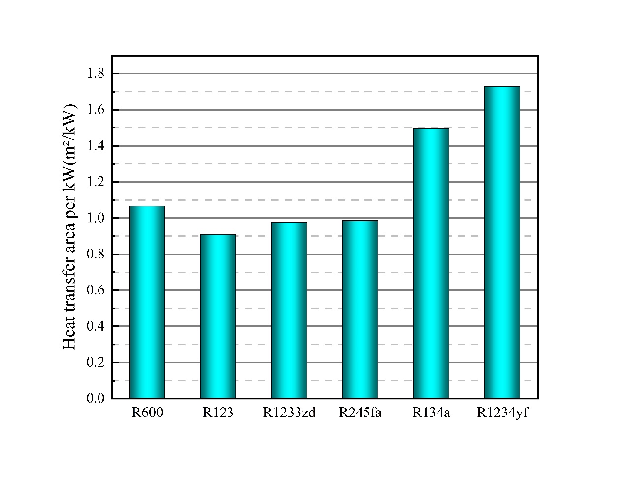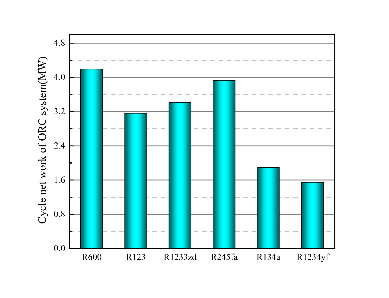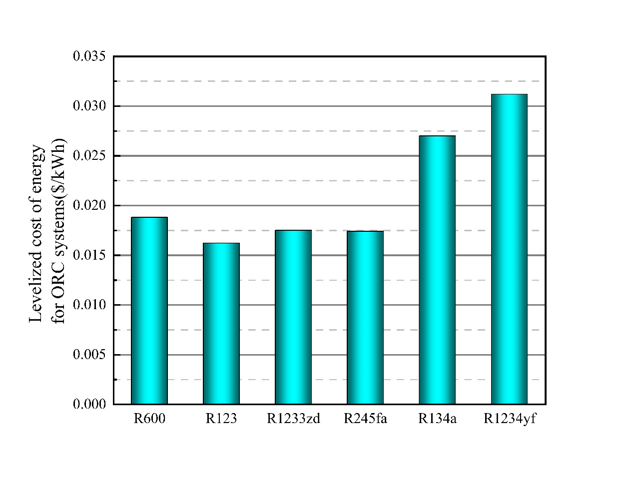 图1给出了使用不同有机工作流体得到的ORC 系统最优净功。可以看出,R600、R1233zd 和R245fa 在最优净功中具有更好的性能。图2给出了不同有机工作流体对应的最小换热器面积(冷凝器+ 蒸发器)。这反映出R123 在单机功率较小场景下具有较高的换热效率。而R134a 和R1234yf 的换热器面积较大,说明它们与热源的匹配度不高。相比之下,R600、R123和R1233zd在换热效率上也具有优势。图3给出了结合净功和换热器面积的平准化度电成本比较结果。R123 在成本方面具有明显优势。但其最佳净功仍然较小,因此可以认为使用R123 的ORC 系统更适用于单机功率较小的场合。此外,R600、R1233zd 和R245fa 都具有良好的经济性,而R1233zd 自身成本较高,目前主要作为添加剂使用。根据ODP 和GWP 指数,生态环境保护政策要求在2030 年完全停止使用R245fa 类ORC。最后,丁烷(R600)作为一种发电工质,可以获得较大的净功,并具有良好的经济性。